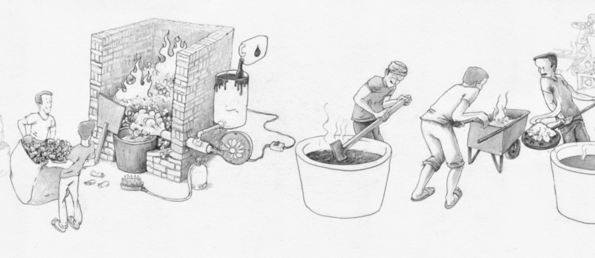 Ces illustrations montrent le processus de la récupération à la transformation des matériaux tels que le plastique l’aluminium et le cuivre.